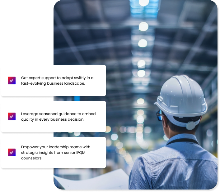 In today’s fast changing business environment, achieving and maintaining quality excellence isn’t a solo endeavor. Organizations face a constant need to adapt, innovate and excel in implementing the choices they make. IFQM can help this effort through its team of senior counselors, who can add value to your organization’s leadership teams across various dimensions of business management.